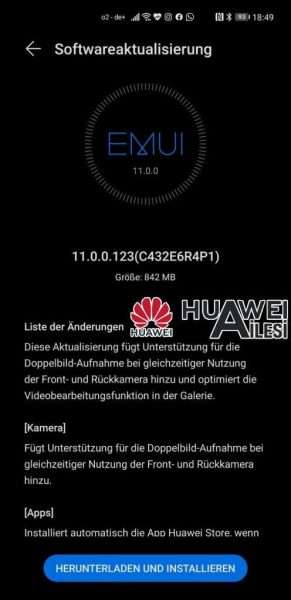 يأتي التحديث EMUI 11.0.0.123 بحجم 842 ميجابايت، ومع تحسينات على الكاميرا وعلى وظيفة تحرير الفيديو في المعرض وكذلك تحسين أمان النظام. تتضمن المميزات الأخرى التالي: