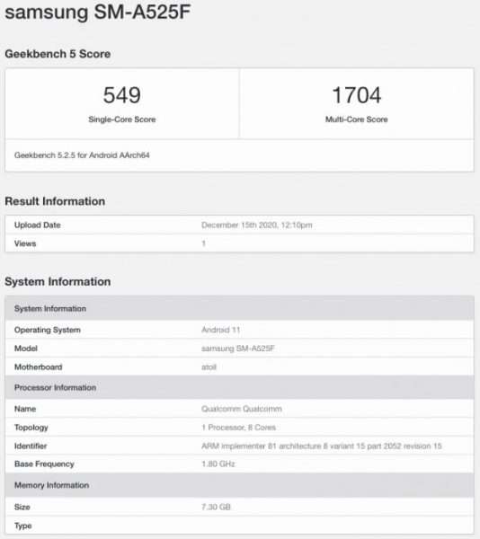 الآن ظهر نسخة جالكسي اى 52 4 جي في منصة Geekbench، حيث يعمل الهاتف بواسطة مجموعة شرائح Snapdragon 720G، ونظام تشغيل Android 11 ويحتوي على ذاكرة وصول عشوائي رام سعتها 8 جيجابايت.