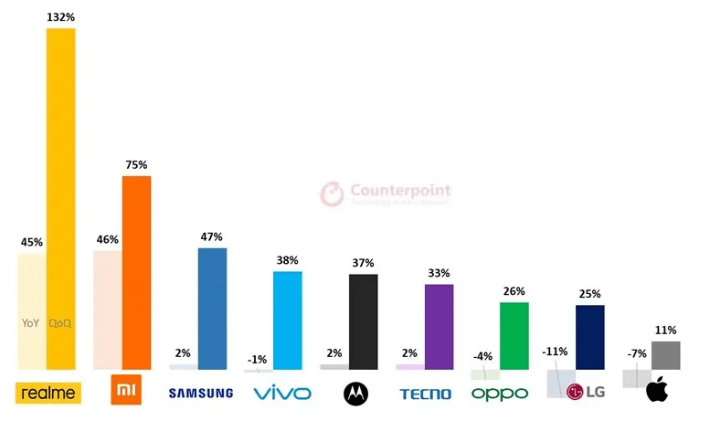 في مثل هذه الفترة الزمنية القصيرة، تمكنت Realme من زيادة شحنات الهواتف الذكية بنسبة لا تُصدق بنسبة 132٪ على أساس ربع سنوي و 45٪ سنويًا ؛ مما يجعلها العلامة التجارية الأسرع نموًا في العالم حيث تم شحن ما يقرب من 50 مليون وحدة منذ إنشائها، وكل هذا على الرغم من الصعوبات التي أوجدها انتشار فيروس كورونا.