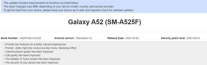 يتضمن التحديث أيضًا تصحيح الأمان لشهر أبريل 2021 ويتوفر في أفغانستان ، أستراليا ، مناطق القوقاز ، مصر ، ألمانيا ، الهند ، إندونيسيا ، العراق ، فلسطين، كازاخستان ، كينيا ، ماليزيا ، باكستان ، الفلبين ، روسيا ، المملكة العربية السعودية ، جنوب إفريقيا ، تايلاند وتركيا والإمارات وأوكرانيا وفيتنام . نتوقع أن تصدر سامسونج هذا التحديث إلى Galaxy A52 في المزيد من البلدان خلال الأيام القليلة المقبلة .