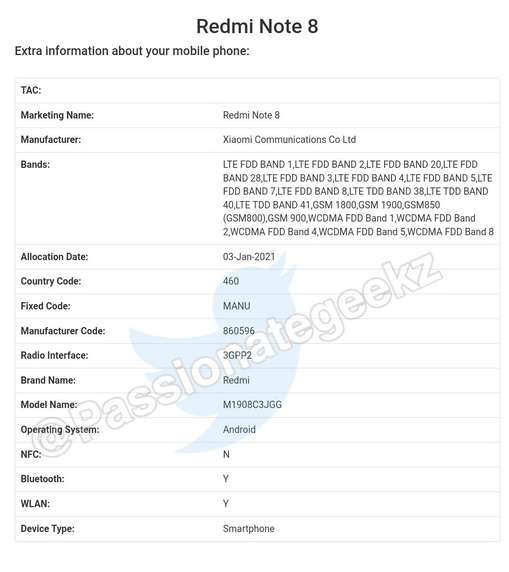 كما زعمت الكثير من المصادر الأخرى أن هذا الهاتف قد يظهر لأول مرة باسم Redmi Note 8 2021، كما سيحمل الهاتف الاسم الرمزي Biloba ويتم التخطيط لإطلاقه إلى أسواق محدودة مثل الأسواق العالمية والاتحاد الأوروبي وروسيا . بصرف النظر عن رقم طراز M1908C3JGG، يبدو أن M1908C3J1 ينتمي أيضًا إلى نفس الهاتف .