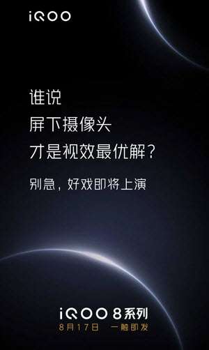 سيتم الكشف عن هاتف iQOO 8 في 17 أغسطس . وتعد iQOO هي العلامة التجارية الفرعية من الشركة الصينية فيفو، وسيتضمن هاتف iQOO 8 معالج سناب دراجون 888 بلس الذي تم الإعلان عنه قبل بضعة أسابيع . كما أنه يتميز بذاكرة وصول عشوائي من نوع LPDDR5 بسعة 12 جيجابايت، وذاكرة تخزين داخلية بسعة 256 جيجابايت من نوع UFS 3.1، وشحن سريع 120 واط. يقال أنه يعمل بنظام تشغيل أندرويد 11 وواجهة OriginOS 1.0 .